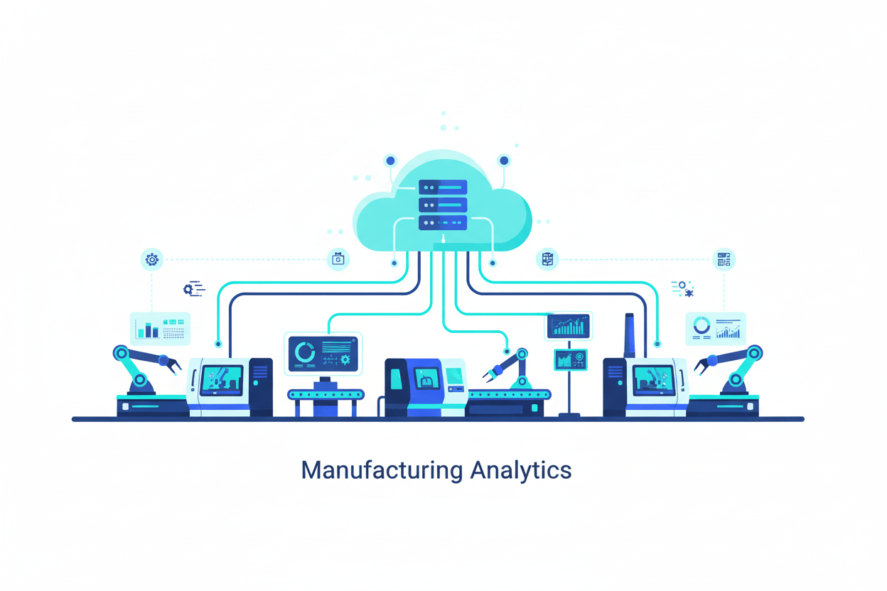 Manufacturing Analytics applies advanced data science, machine learning, and AI to operational data from production equipment, quality systems, and enterprise applications. It transforms raw sensor data and process metrics into actionable insights that predict equipment failures, optimize production efficiency, automate quality control, and reduce operational costs. Benefits include 30-45% maintenance cost reductions, 15-28% OEE improvements, 50-70% fewer unplanned downtime incidents, and 18-25% energy cost savings through data-driven decision-making.