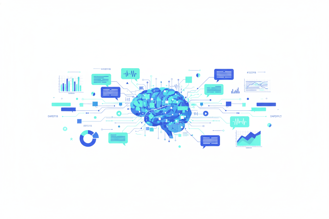Combine text analysis with voice, image, and video data for comprehensive understanding using unified AI frameworks and cross-modal correlation engines